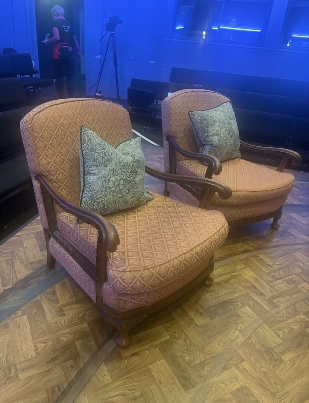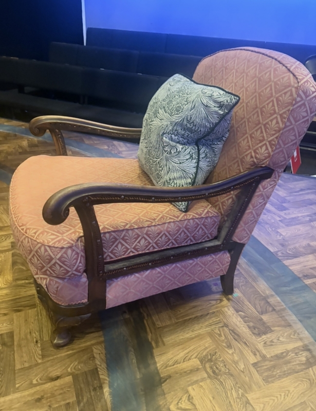 Pair of 1930s armchairs upholstered in a pink damask used in THE RAT TRAP at Park Theatre. Available to collect from West Ealing. Wicker work needs replacing.