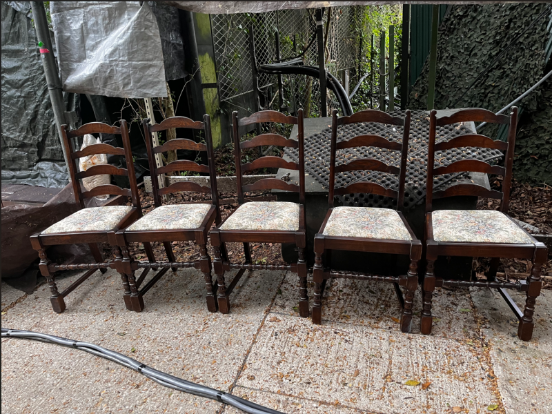 5 matching dark wood chairs - mahogany appearance. Cushioned seats with traditional floral pattern.