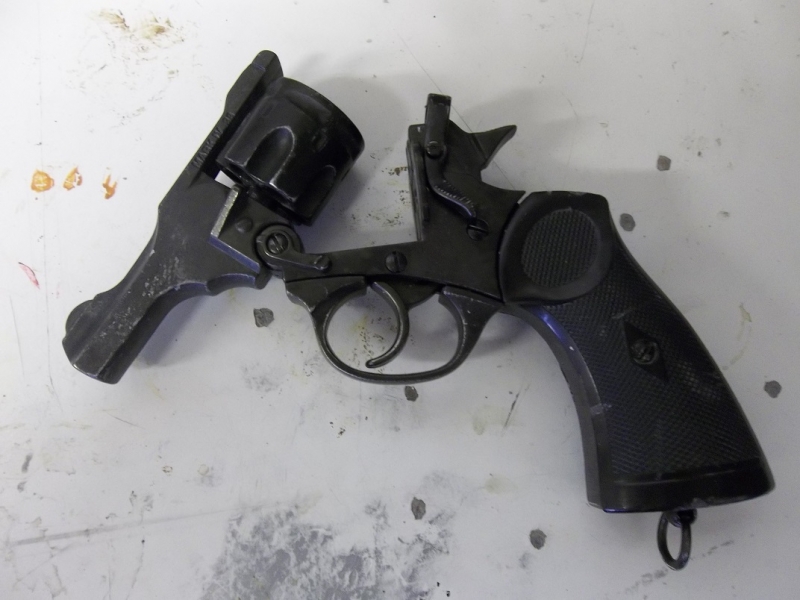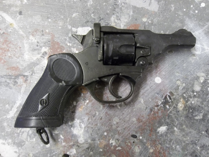 A snub-nosed version of the British Webley Mk.4 service revolver. I deal for costuming British Officers anywhere from the Boer Wars through to WW2... Full metal construction. Drum rotates, can be dropped, and hammer and trigger function and dry fire. Can also be supplied with a canvas service revolver holster and lanyard.