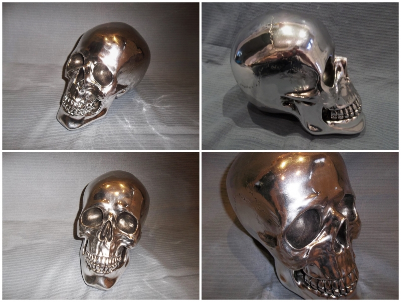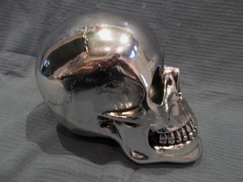 A large cast resin skull, finished in chrome.