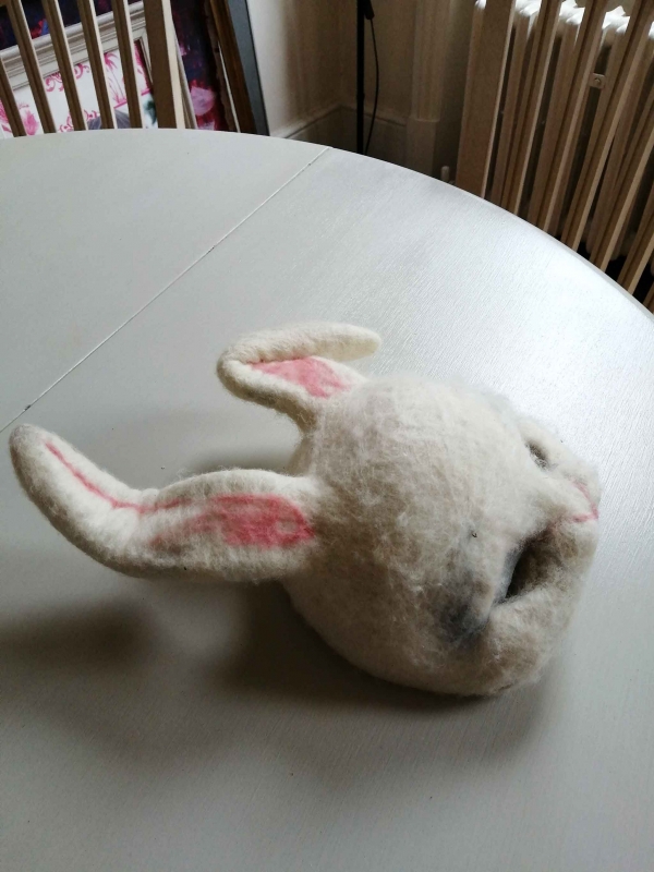 Beautifully handmade rabbit mask. Thick felt with gorgeous pink detailing. This really is a very high quality piece. Great for Alice in Wonderland productions, other shows, and would also look stunning as a piece of art decorating a theatre/venue.