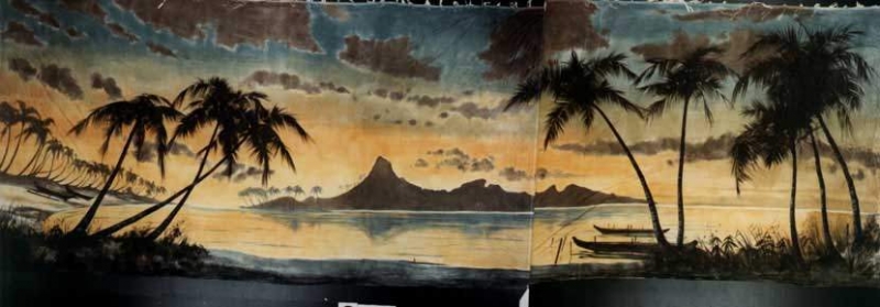 Very large image (South Pacific?)17m x 6m with tabs. Like all theatre gauzes, it is painted on the upstroke of the brush so best ground lit or can become see-through when lit from the front. Multiple week discounts