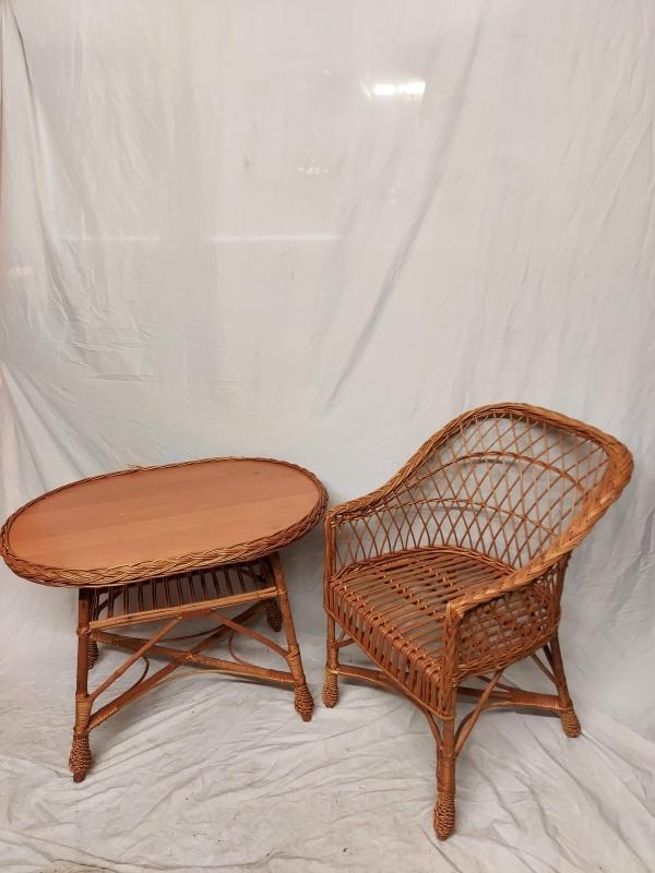 Wicker garden chairs x4 with matching coffee table chair size Seat Height=42cm Back Height=82cm Width=53cm outside 45cm in arms Depth= 50cm Table size Height=82cm Width=61cm Length=83cm Please contact for hire details