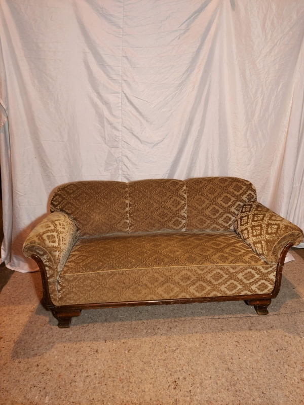 1930 green 3 seat sofa with removable arm Seat height=51.5cm Back height= 81cm Length=1m 76cm Width between arms=1m 30cm Depth=76cm Notes= heavy Please contact for hire prices
