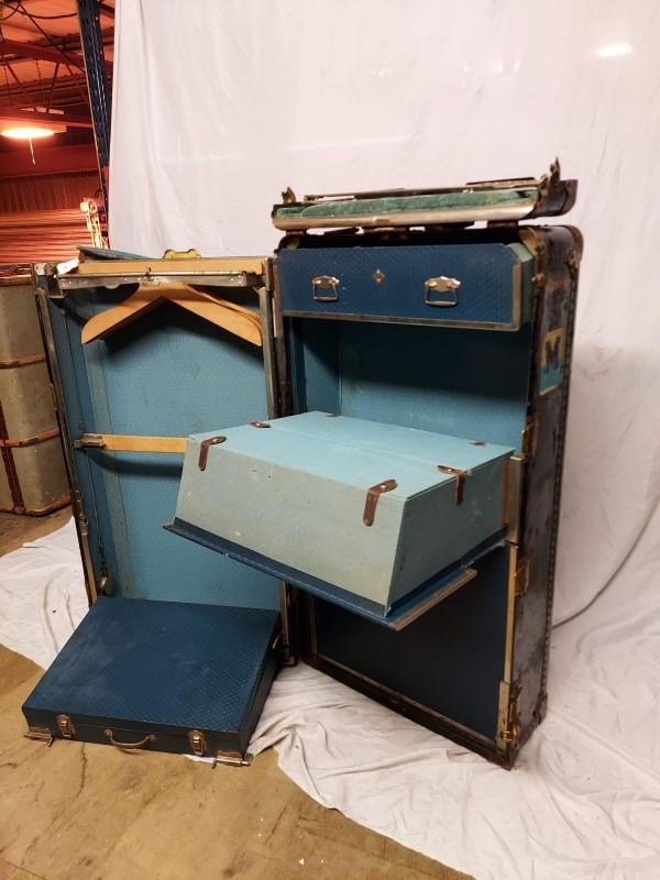 Black Vintage steamer trunk / portmanteau blue inside very heavy (no key) Width = 54cm Depth = 37.5cm Lengh = 103.5cm Please contact for hire information