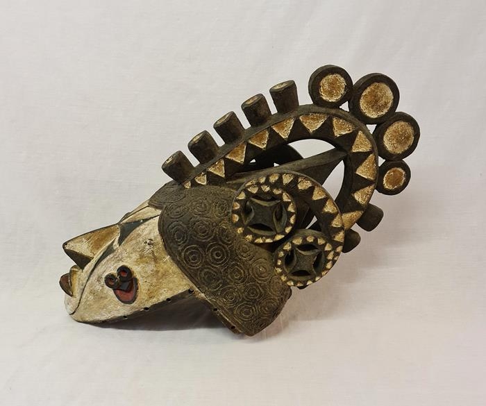 A superbly carved large Igbo mask from Nigeria. This traditional style of helmet mask is approximately 63cm tall x 31cm deep x 22cm wide and is in excellent condition for its age.