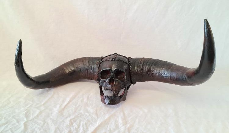 Resin reproduction Naga human skull and buffalo horns, approx 60cm wide. Dark and realistic.