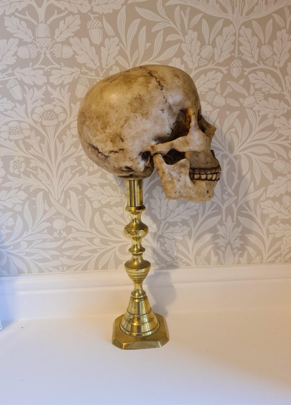 Life size vintage looking human skull mounted in a brass stand approximately 36cm tall. One of a range of Gothic style skulls available.