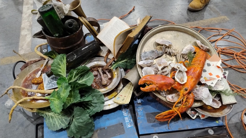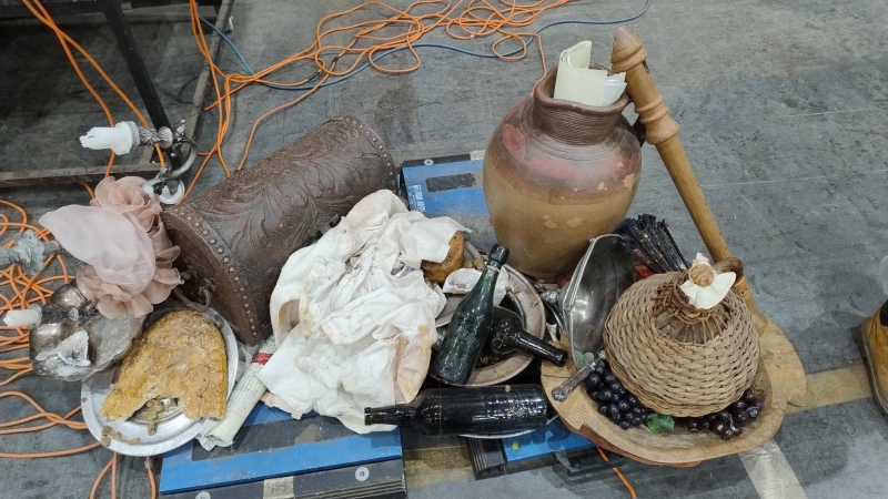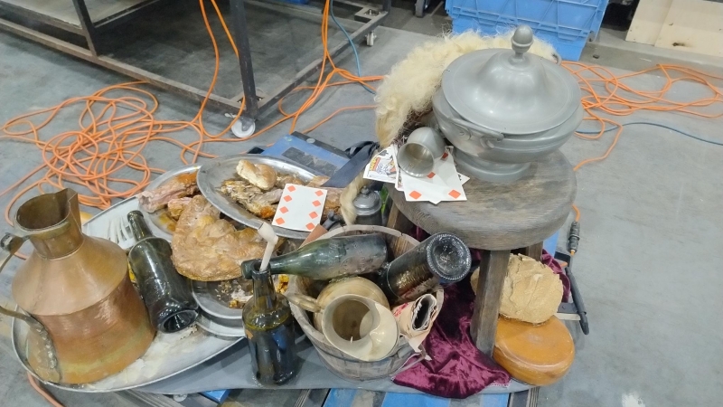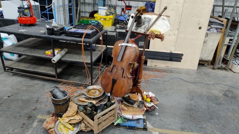 Various piles of items, attached together and used as set dressing