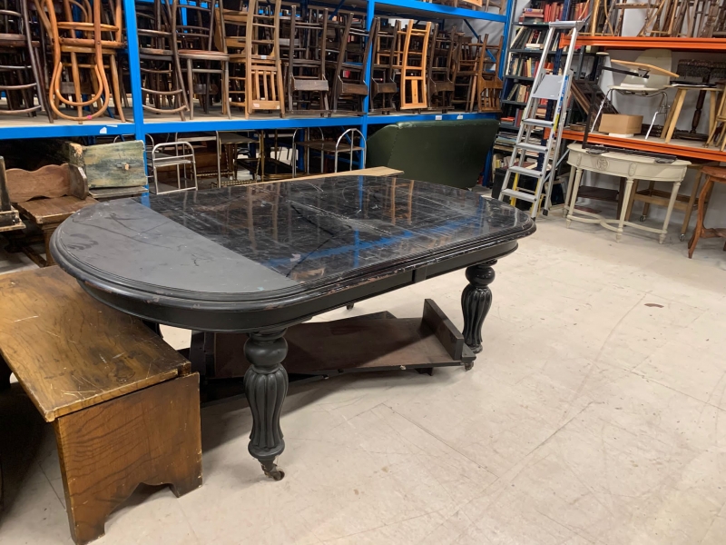 chonky vintage table with two additional leaves, with some love should open up from fitting 6 comfortably to 12 uncomfortably. Would benefit from a bit of refinishing -OR- a tablecloth. Will require a Transit at minimum, just over 2m long, 80cm tall.